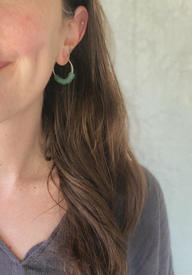 Simple, natural earrings made with aqua glass on hammered hoops in your choice of sterling silver or gold-filled wire options.